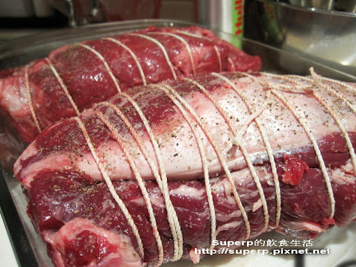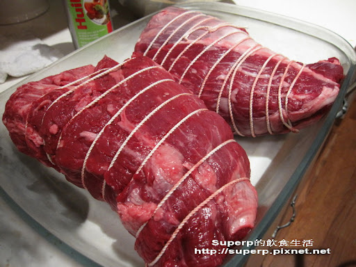 用繩子把牛肉給綁起來,這樣烤起來形狀比較好看