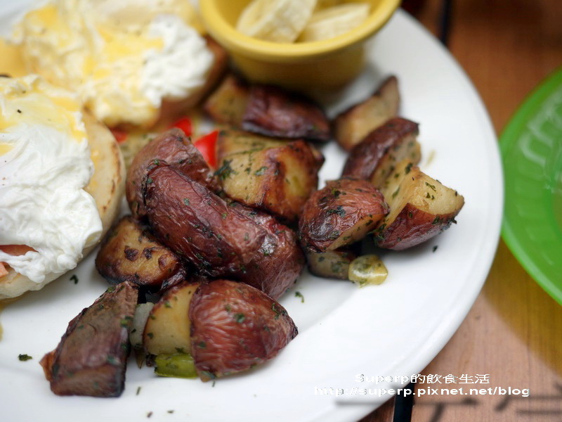 燻鮭魚班尼迪克蛋$280(除了燻鮭魚班尼迪克蛋以外,還有烤薯塊,以及香蕉。烤薯塊還加了香料去烤,我覺得比薯條好吃。班尼迪克蛋是半熟的,基本上應該怎麼做都好吃,無可挑剔。不過我覺得這次的燻鮭魚似乎品質沒那麼好,跟班尼迪克蛋一起吃並沒有加分的作用。我看以後我會選擇原味的,或菠菜還是酪梨蝦仁班尼迪克蛋)