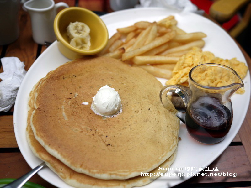 美式煎餅早餐$220(就是兩大片的鬆餅,薯條,兩條香腸,炒蛋,以及香蕉。鬆餅還好,炒蛋倒是很不錯,不過也不是我會想點的餐)