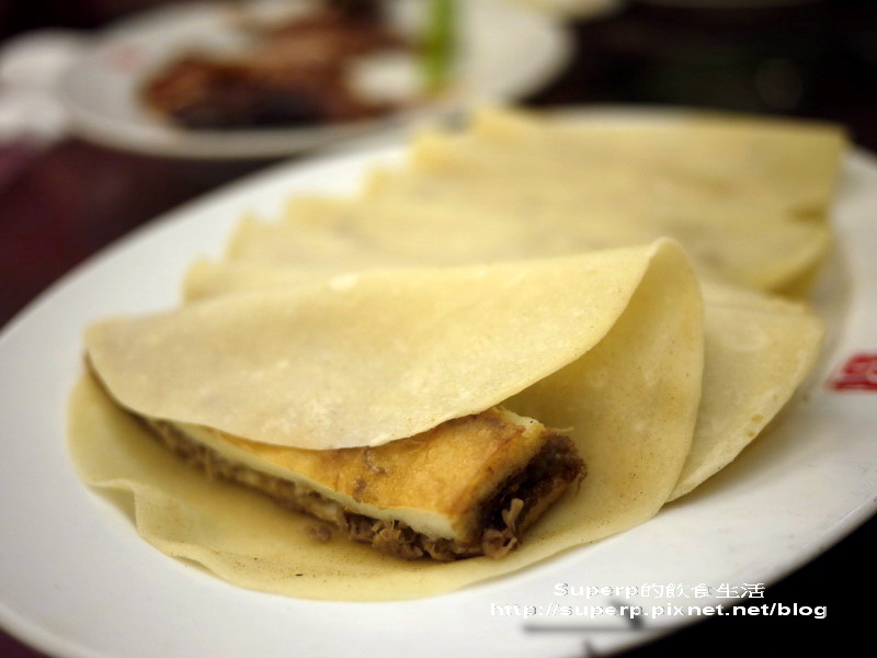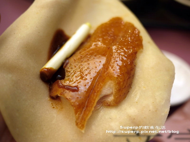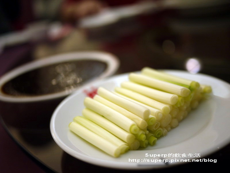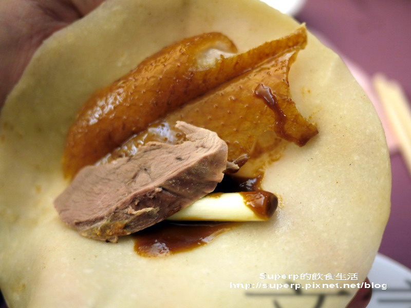 這邊所附的蔥比較「純樸」,不像宋廚切的掃帚樣,或龍都加了一環提味的辣椒。荷葉餅的部分也比較厚一些。