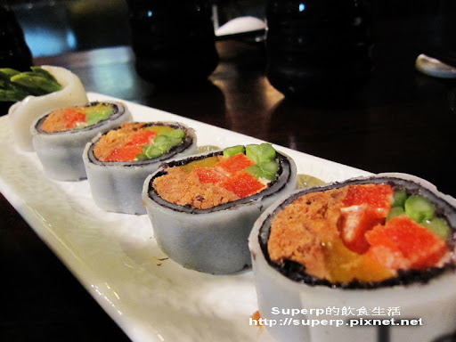 龍蝦卵河粉捲(裡面還有包肉鬆和蘆筍,其實還不錯。不過我吃了一下那紅紅的部分,完全沒有卵味,味道甜甜的。問了一下店員他們也不知那是什麼XD)